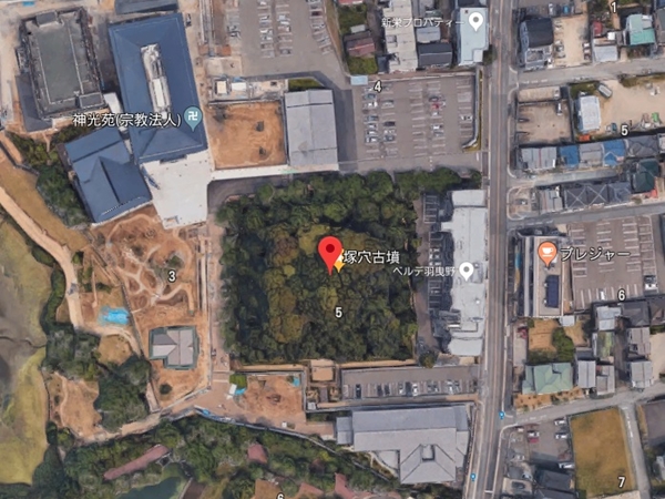塚穴古墳は少々わかりにくい場所にあります。塚穴古墳の北、西、南は宗教施設になっており、立ち入ることができません。