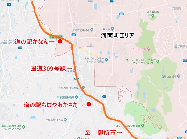 「道の駅かなん」は南河内と奈良を結ぶ国道309号線沿いに位置しています。千早赤阪村の「道の駅 ちはやあかさか」も隣接はしていませんが、同じく国道309号線に近い場所に作られています。