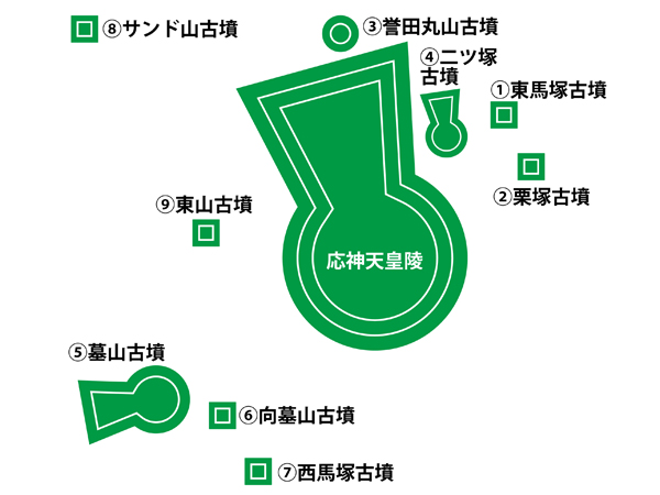 1~8が宮内庁より応神天皇陵の陪塚に指定されています。しかし、5~8は実際には応神天皇陵の陪塚ではないと考えられています。