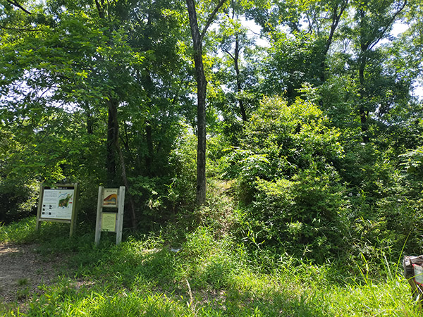 烏帽子形八幡神社から5分ほどで古墳広場に到着。普段だれも来ないのか、夏場は草が生い茂っています。